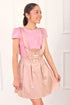 Jumper con falda de estilo elegante y clásico. La prenda se destaca por un faldón estructurado con tableros (pliegues) que le dan un volumen sofisticado. La pechera presenta un corte curvo, delicados volantes y un pasante dorado en el centro, aportando un toque de lujo. La pretina incluye un lazo decorativo. Para mayor confort y una caída perfecta, cuenta con forro interno de tafeta. JUNA0037