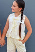 Compuesto por una blusa de brodery con un encantador faldón y tirantes ajustables que se cierran formando delicados lazos frontales, permitiendo un ajuste personalizado. Se complementa con un top básico de tirantes elaborado en 100% Algodón Pima, ideal para proteger la piel sensible, y un pantalón de corte amplio que incluye una pretina elasticada en la parte posterior para mayor flexibilidad. Pensando en la tranquilidad de los padres y la libertad de la niña, el pantalón cuenta con prácticos bolsillos frontales y un short interno forrado en nansú. OTNA0017