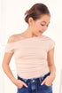Top moderno y elegante confeccionado en tela Venecia. Presenta un diseño asimétrico de hombro descubierto, y un delicado elasticado en los hombros y costados que frunce la tela. Este fruncido no solo estiliza la figura, sino que también ofrece la mayor comodidad. TPNA0002